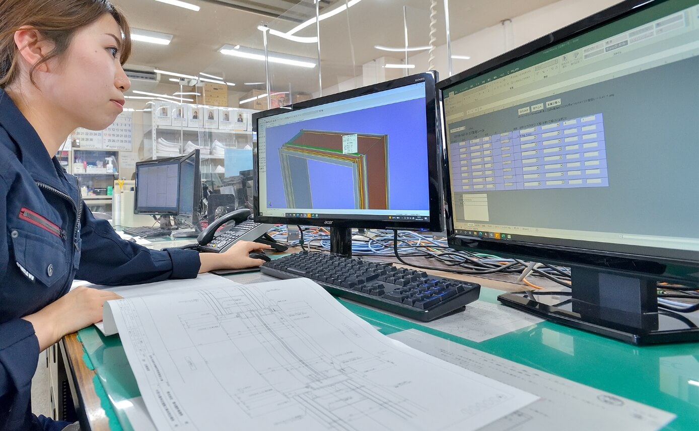 お客様から提供されるステンレス製建具、各種建築金物、各種サッシの施工図、各種機械装置・部品の図面から、工場での製作を行うための部品図を作成する業務になります。